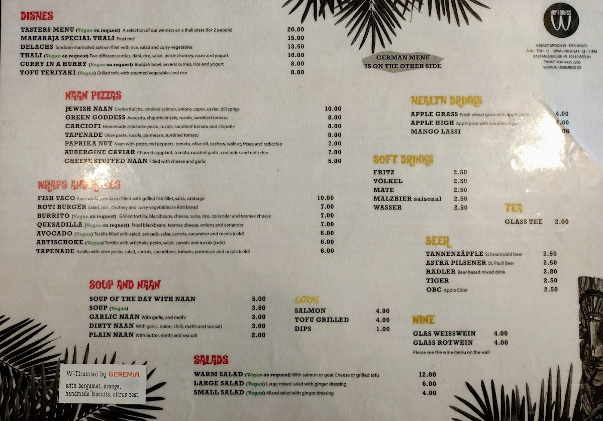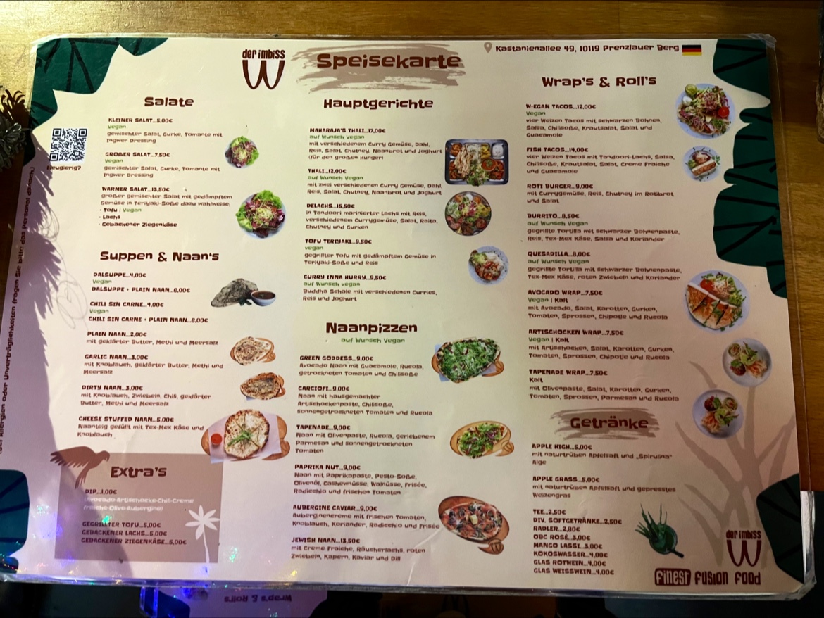 Introducing W The Imbiss, a hidden gem nestled in the heart of Berlin at Kastanienallee 49. This vibrant eatery masterfully fuses flavors from various cuisines, making it the quintessential stop for food lovers. Renowned for their Fish Tacos—a local favorite praised for its massive portions and fresh ingredients—these tacos come adorned with a delightful salad and three appetizing sauces: spicy, guacamole, and sour cream.